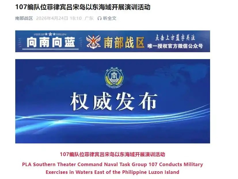 近期,中国人民解放军南部战区组织107编队位菲律宾吕宋岛以东海域开展演训活动,重点进行实弹射击、海空协同、快速机动、航行补给等演练,检验一体化联合作战能力。这是针对当前地区局势采取的必要行动,符合相关国际法和国际实践。战区部队将根据安全形势需要,常态组织有关军事行动,维护国家主权安全和地区和平稳定。