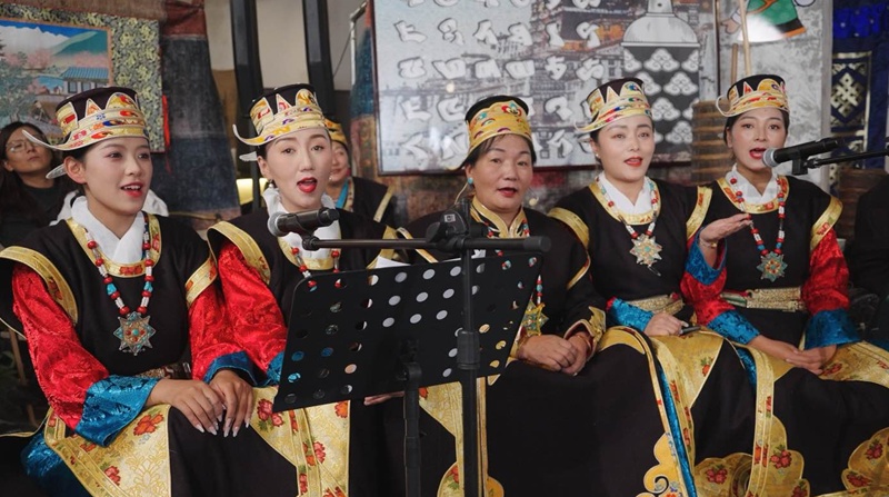 在互动体验环节,活动将工布文化与冬游打卡深度结合。非遗代表性传承人现场带领体验工布传统“切巴博”舞蹈,现场生动还原了阿拉(林芝荞麦饼)制作、吃结达等充满烟火气的工布美食年俗场景,游客与市民共同参与,感受工布人民的热情;讲解林芝藏族服饰文化,鼓励游客身着传统服饰,打造专属冬游西藏记忆;艺术家们演唱《这户人家》《三朵花》等工布特色歌曲,在工布扎念博咚、热玛琴、大鼓的节拍配合下,歌声回荡现场,彰显了工布传统文化在当代的鲜活生命力,传递了冬游西藏的美好体验。